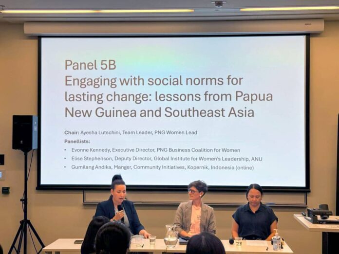 Panel discussion on ‘Engaging Social Norms for Lasting Change’ at the Australasian Aid Conference. From left to right Ayesha Lutschini, Team Leaders, PNG women Lead Program; Elise Stephenson, Deputy Director, Global Institute of Women’s Leadership, ANU; Evonne Kennedy, Executive Director, PNG Business Coalition for Women.