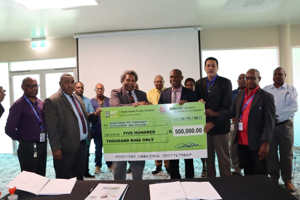 As part of its commitment, the Kikori DDA presented a K500,000 dummy cheque to the Department of Community Development and Religion, representing the first instalment of its K750,000 contribution towards the project.