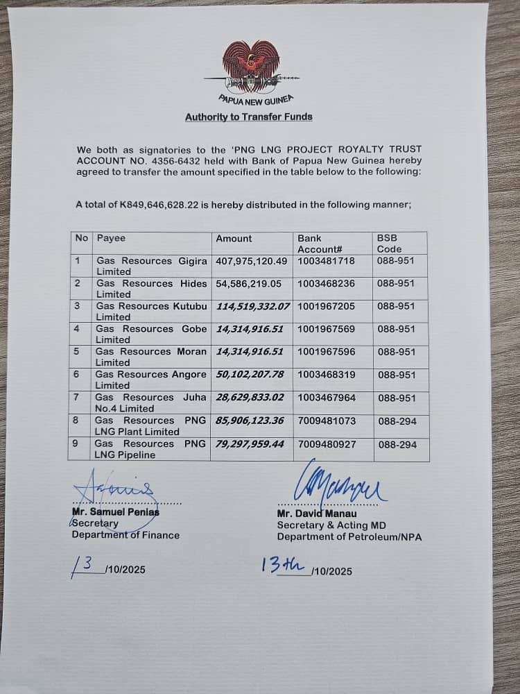 Minister fomr Finance Thomas Opa has clarified that the K850 million royalty trust funds for landowners of the PNG LNG Project are not from 2025 Budget appropriations and not GOPNG funds.