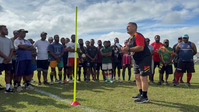 PNG NRL Academy Coaching and Pathways Manager Joe Grima addresses the participants at the Goroka course. Picture supplied.